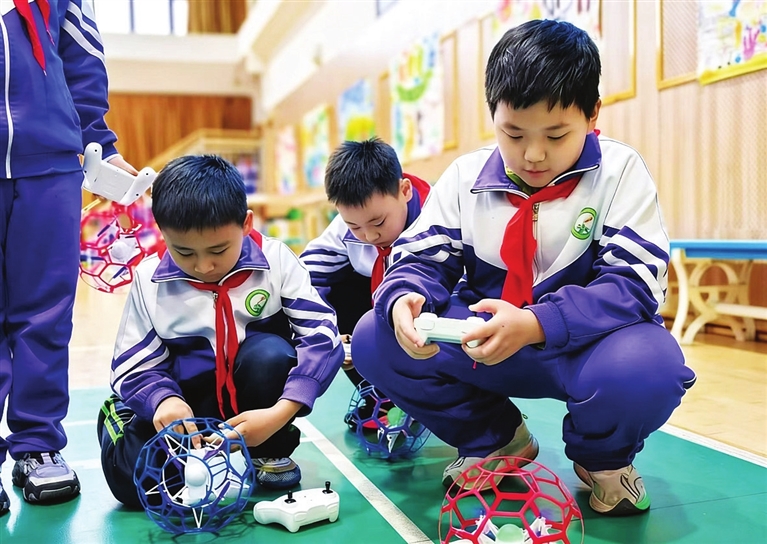 社团的多数孩子二年级开启无人机基础学习,经过一学期系统训练,便从容站上赛场完成系列飞行动作。学校组建“技术+体育”跨学科教学团队,科技老师教操控调试,体育老师传授攻防战术,让孩子既懂飞行技术,又通赛场章法。