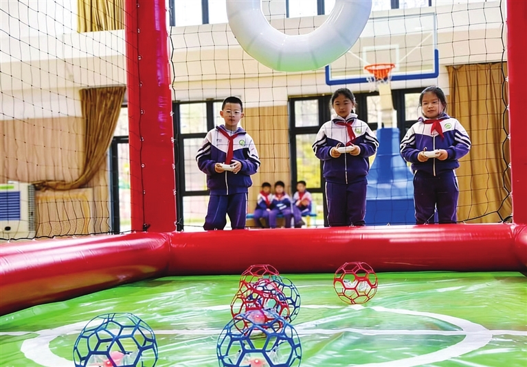 赛场上,孩子们灵活操控遥控器,无人机在限定空间内激烈对抗,进球时的欢呼、失误后的互相鼓励,让飞行技术在实战中精进,更培养了坚韧精神与协作能力。“每次比赛都像‘空中战场’,紧张又刺激,越比越想练!”三年八班张杰皓分享道。