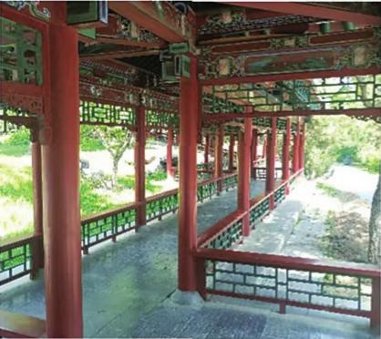伏龙园长廊的南端是枕流亭。廊道与枕流亭相连处,微微向东北曲折百余步后,折向北面,经过一座长方形四角卷棚亭,向北便是伏龙园的园门,过园门继续向北,并逐渐折向西北数十步,到达颐景亭止步。长廊整体呈“凹”字形排列,几乎相当于伏龙园的围墙。