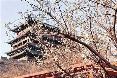 五一广场北广场,山桃花映衬着“锦绣太原”城楼。