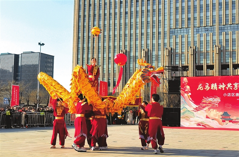 下午2时30分,山西转型综合改革示范区诚信广场上热闹非凡,化章堡社区的锣鼓表演《二月二·金鼓开鸿运》拉开活动帷幕,铿锵有力的鼓点瞬间点燃现场气氛,观众纷纷鼓掌叫好。紧接着,南黑窑社区的舞龙节目《龙腾盛世金龙献瑞》惊艳亮相,两条金色长龙在队员们手中翻腾起舞;梧桐社区的秧歌舞喜庆欢快,演员们身着彩衣,手执绸扇,舞步轻盈、节奏明快;南畔社区的传统民俗表演《抬铁棍》将活动推向高潮,队员们身着传统服饰,肩抬装饰精美的铁棍,展现出这一古老民俗的独特魅力。