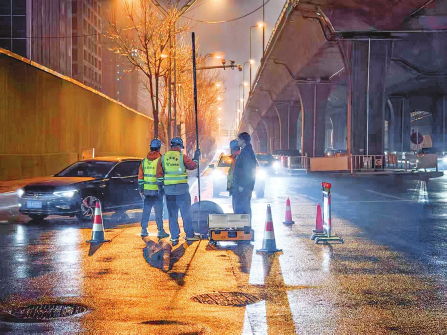 他们用钎子把井盖撬开,将听音杆探入,一端接触管道,一端贴近耳畔——通过辨别水流声为管网“听诊把脉”。这样的细致排查,通常要持续到凌晨3时。
