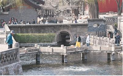 阳春三月,步入位于山西省太原市的晋祠公园,阳光照向晋祠圣母殿,鱼沼飞梁,光影浮动,游人驻足在难老泉前,或拍照定格春日景色,或静听泉水潺潺。晋祠难老泉是汾河流域的8个岩溶大泉之一,距今已有2400余年历史,泉水自悬瓮山断岩层涌出,常年水温17摄氏度,水质清澈,长流不息,唐代诗人李白曾赞:“晋祠流水如碧玉”。