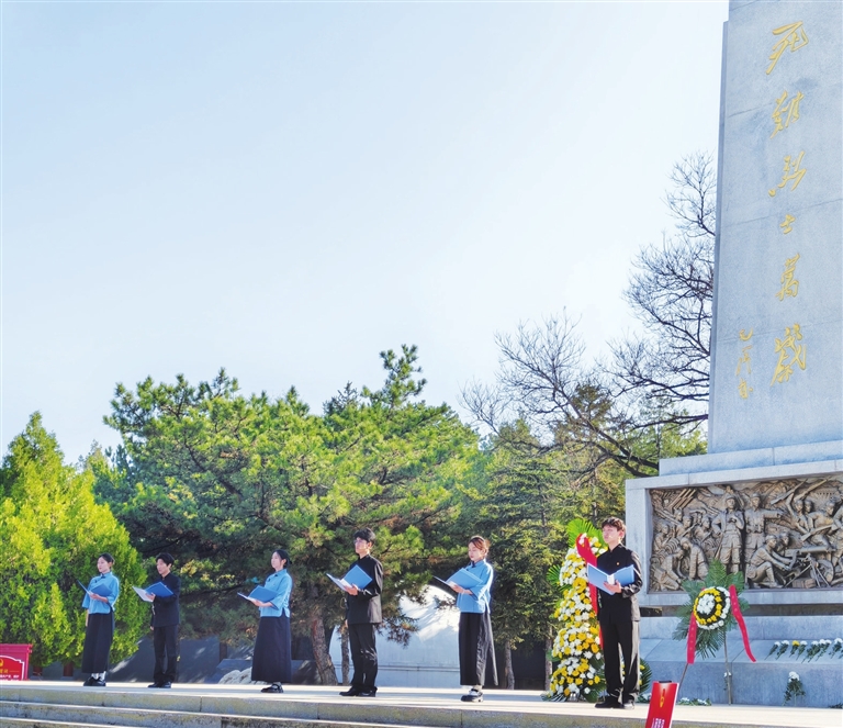 “我志愿加入中国共产主义青年团……”在烈士纪念碑前,全体团员青年高举右拳,重温入团誓词,铮铮誓言回荡陵园,彰显新时代青年传承红色基因、勇担时代使命的坚定决心。随后,大家依次为英烈献花,表达追思与敬仰。