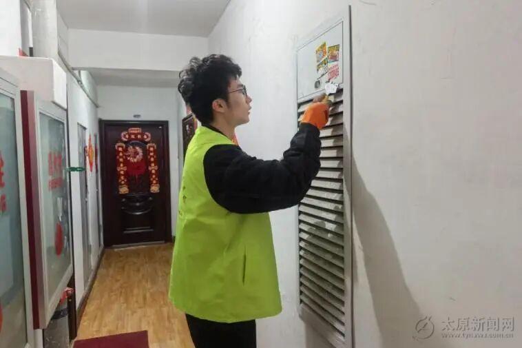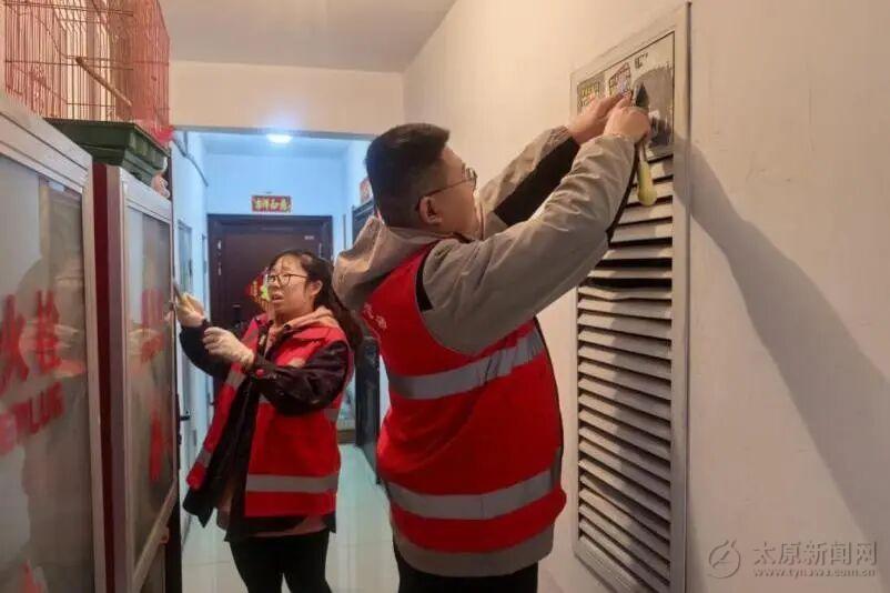 身着志愿绿马甲的青年们主动扛起高楼层、难清理区域的攻坚重任,用实际行动彰显青年担当。大家手持铲刀、喷壶、抹布等工具,对楼道墙面、管道外壁、电表箱、消防设施等区域的小广告开展“地毯式”排查清除,不留死角、不漏一处。面对粘贴牢固、反复滋生的墙面“牛皮癣”,志愿者们耐心浸湿软化、细致反复铲除,即便手臂发酸、额头冒汗,也始终坚守岗位,用专注和坚持还原楼道洁净空间,让青春身影成为社区里最亮眼的风景。