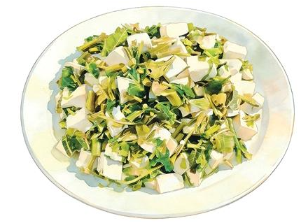 香椿头拌豆腐素净清雅、鲜香质朴,不仅是应季美味,更暗含清明廉洁、身心清净的意趣,渐渐成为一道颇为雅致的文人菜。明代李濂在《村居》中写“留客剪椿芽”,剪下鲜嫩欲滴的椿芽,将春色一同端上饭桌;清代李渔在《闲情偶寄》中提到香椿,称“菜能芬人齿颊者,香椿头是也。”到了现代,美食家汪曾祺更是偏爱,称“香椿拌豆腐是拌豆腐里的上上品”“一箸入口,三春不忘”。
