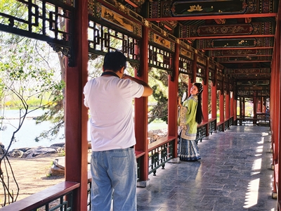 许多市民留意到,古建间、花丛中,常能见到身着传统服饰拍照的年轻人。他们或在亭台楼阁前摆姿定格,或围着盛放的花树互拍留念,成了最鲜活的春日图景。