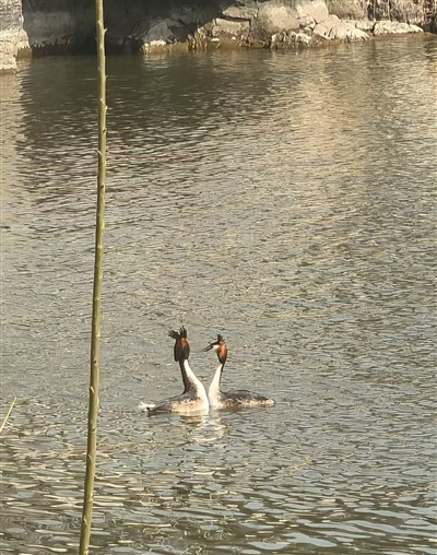 这群水鸟里,两只鸟儿尤为亮眼,也是我近期常在此处遇见的“老熟人”。它们脖颈修长挺拔,背与后颈羽呈温润的棕褐色,前胸与前颈却洁白如雪,最别致的是头部:脸颊与尖喙构成利落的三角,头顶一撮红褐色羽冠向后舒展,在阳光下格外醒目。这两只鸟宛如默契的舞者,时而分聚,时而相向,或携手潜入,或并肩浮出水面。两两相对时,活像亲密情侣低声私语,全然不顾岸边的镜头,自在又温情。我不停按下快门,生怕错过任何一个动人的瞬间。
