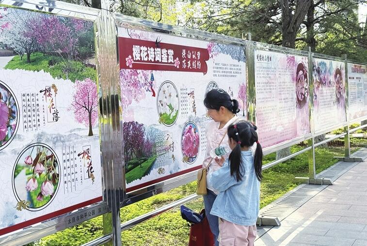 赏花过程中,孩子不时提出疑惑,妈妈耐心解答。和平公园内,还设立了樱花诗词、晚樱鉴赏等知识展板,吸引了不少游客关注。