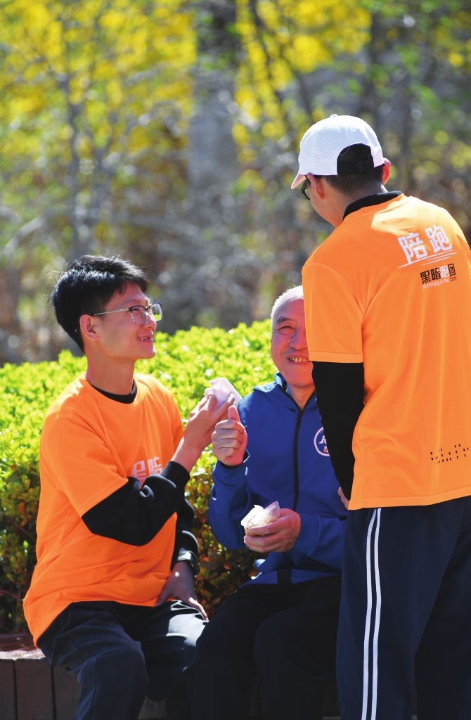 裴真是最早一批陪跑员,他还记得和视障跑者元帧初次搭档的场景。元帧起初紧张不安,担心自己的动作会给裴真带来困扰。裴真耐心地用指令引导,还学着和元帧的导盲犬配合,帮他辨别方向。一次次奔跑,一次次歇脚时的家常闲聊,让两人渐渐形成了默契,元帧脸上的笑容也越来越灿烂。“他们给予的百分百信任,让我真切感受到自己被需要,能为别人带去能量。”裴真说。