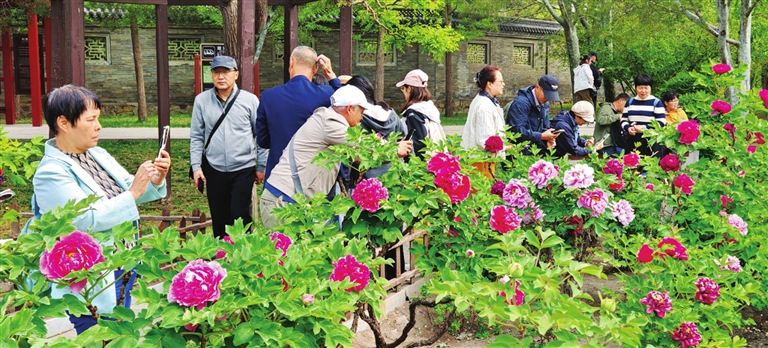 沿石径步入公园中部牡丹园,千余株牡丹连片盛放,红似火、粉如霞、白胜雪,罕见的绿牡丹与紫斑牡丹点缀其间。微风过处,花影摇曳,暗香浮动,与周边的亭台楼阁、小桥流水相映成趣,为这片花海平添了几分清雅古韵。花间小路上,不少游客身着唐装、汉服,衣袂翩然,或执团扇轻倚花枝,或与友人笑谈留影。摄影爱好者们举起相机,快门声此起彼伏,定格下一幅幅“人在画中游”的精美画面。