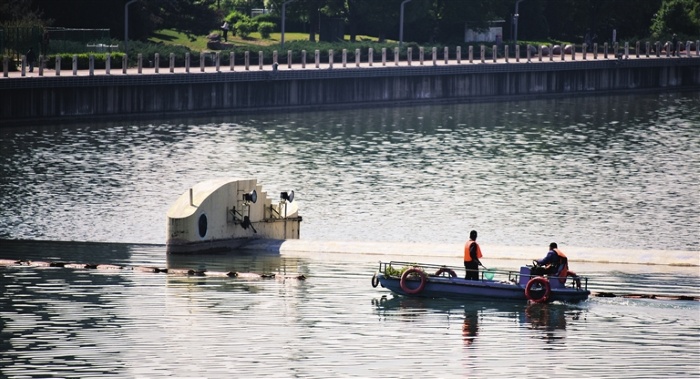 4月29日,工作人员正在汾河上打捞垃圾