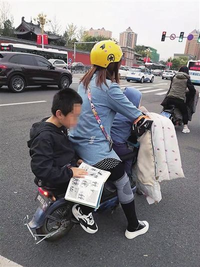 这是10月8日,我在府东街解放路口看到的一幕。一名骑电动车的女子,不但带着两个孩子,还在车把上装了挡风被,这样很容易造成车头方向控制不稳,制动不灵,如果出现紧急情况,来不及控制,容易发生事故。希望大家引以为戒。