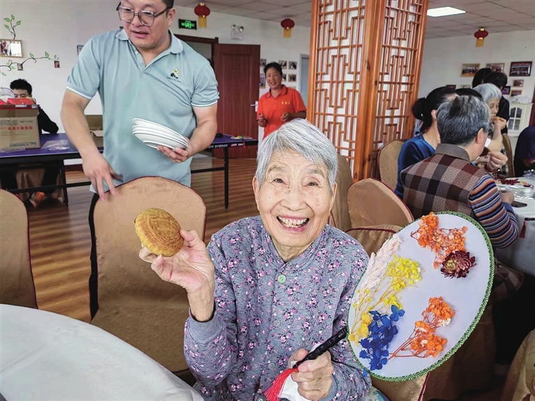 工作人员首先给大家介绍中秋节的由来及习俗,随后,给现场的老人们分发制作古风团扇的材料,大家跃跃欲试,开始了一场关于艳丽的鲜花、浓郁的青草与素雅的团扇相结合的美好体验。老人们先用干花在团扇上摆出自己想要的图案,随后用胶水固定干花。91岁高龄的朱桂兰,在家人的陪伴下拿着画笔开始琢磨,认真上色,“把干花一层层黏上去……对,就是这样,您做得真好!”听到工作人员的夸赞,老人笑得像孩子一样。